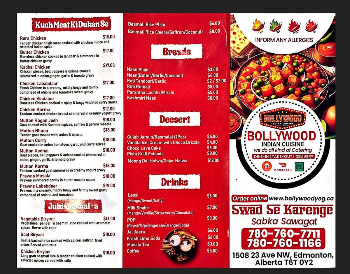 Welcome to Bollywood Indian Cuisine, a vibrant culinary gem located in Edmonton, Alberta. This restaurant promises an authentic Indian dining experience, delighting guests with a menu brimming with flavor and freshness. Highlights include their Dahi Bhalla, a delicate lentil dumpling paired with creamy yogurt and tangy tamarind sauce, and the Butter Chicken, known for its perfect spice balance that even children can enjoy.